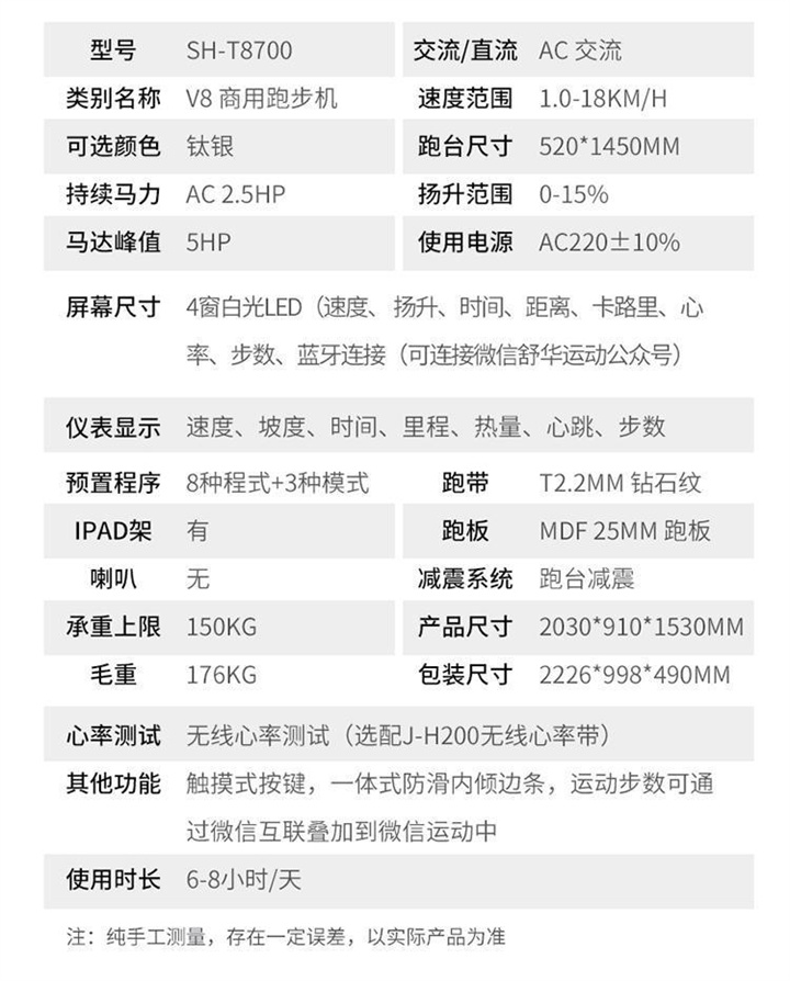 舒華商用跑步機(jī)SH-T8919采用t2.2mm黑鉆紋(可選配:t2.4免維護(hù)跑帶)的跑帶,,選用手握心率測(cè)試 自帶心率帶及增加心率控速(HRC)程序模塊、接觸式心率感應(yīng)測(cè)量心跳等數(shù)據(jù),跑步面積達(dá)580×1570mm,可承受180kg的使用者使用。