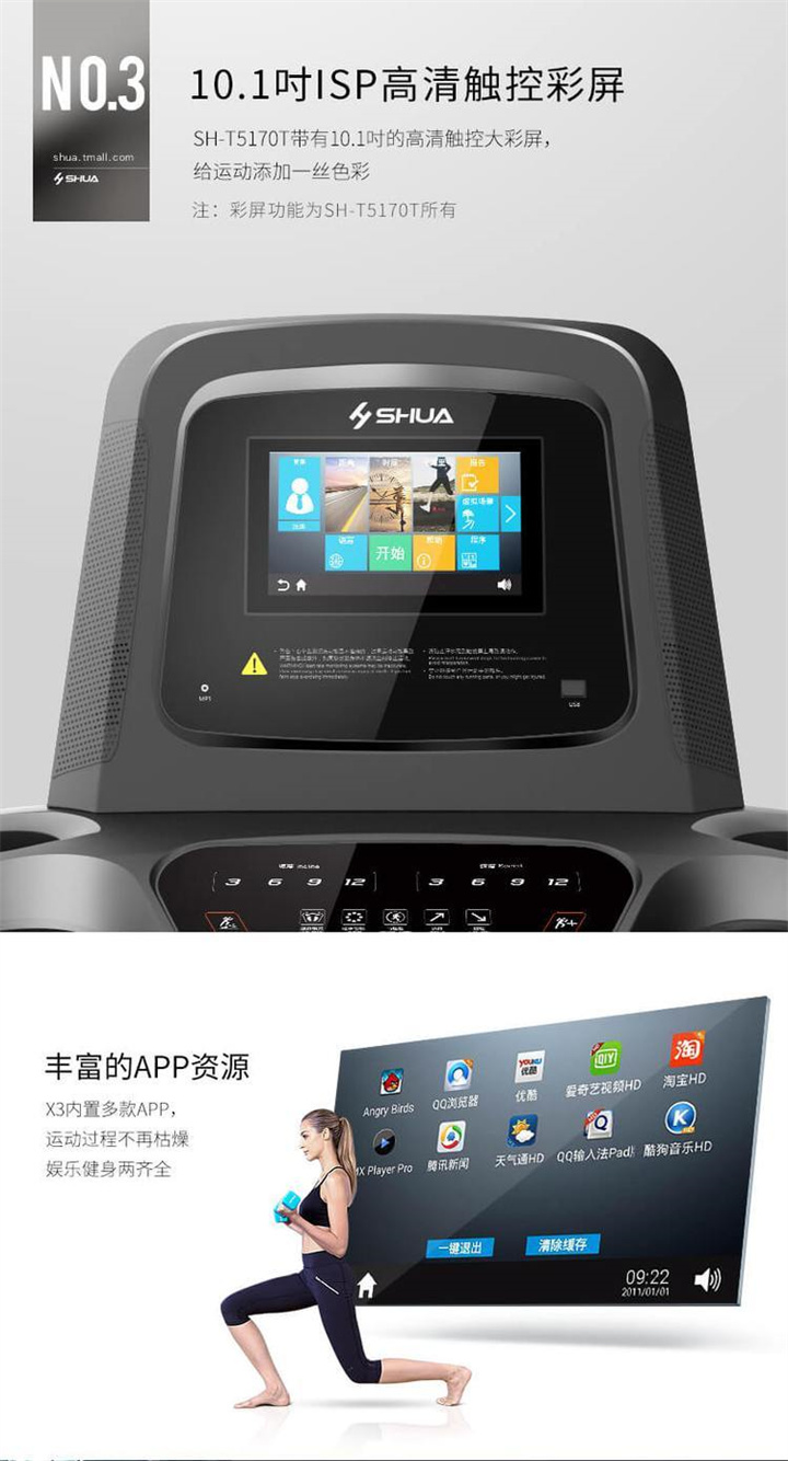 智能商用跑步機(jī)SH-T8919T-Y50(V1+)采用T2.2mm黑鉆紋(可選配:T2.4免維護(hù)跑帶)的跑帶,選用手握心率測(cè)試 自帶心率帶及增加心率控速(HRC)程序模塊測(cè)量心跳等數(shù)據(jù),跑步寬度達(dá)580mm,可承受180kg的使用者使用。
