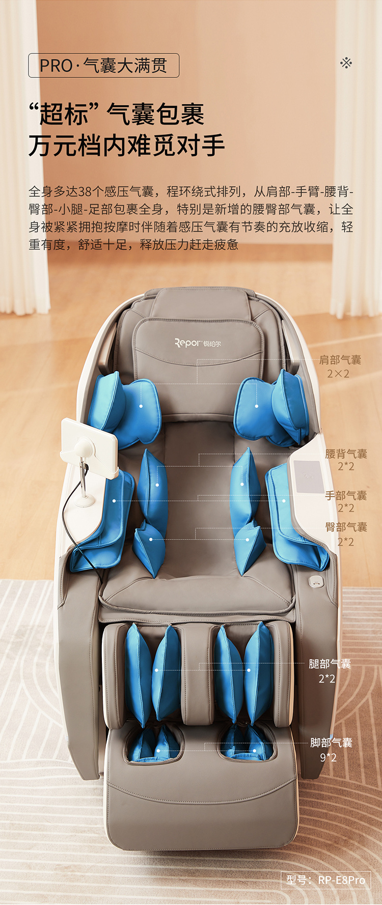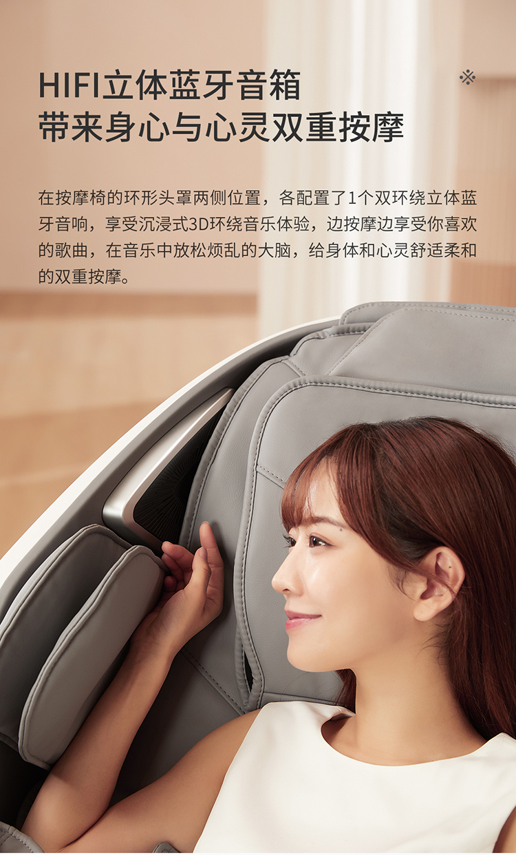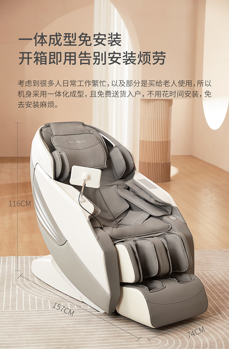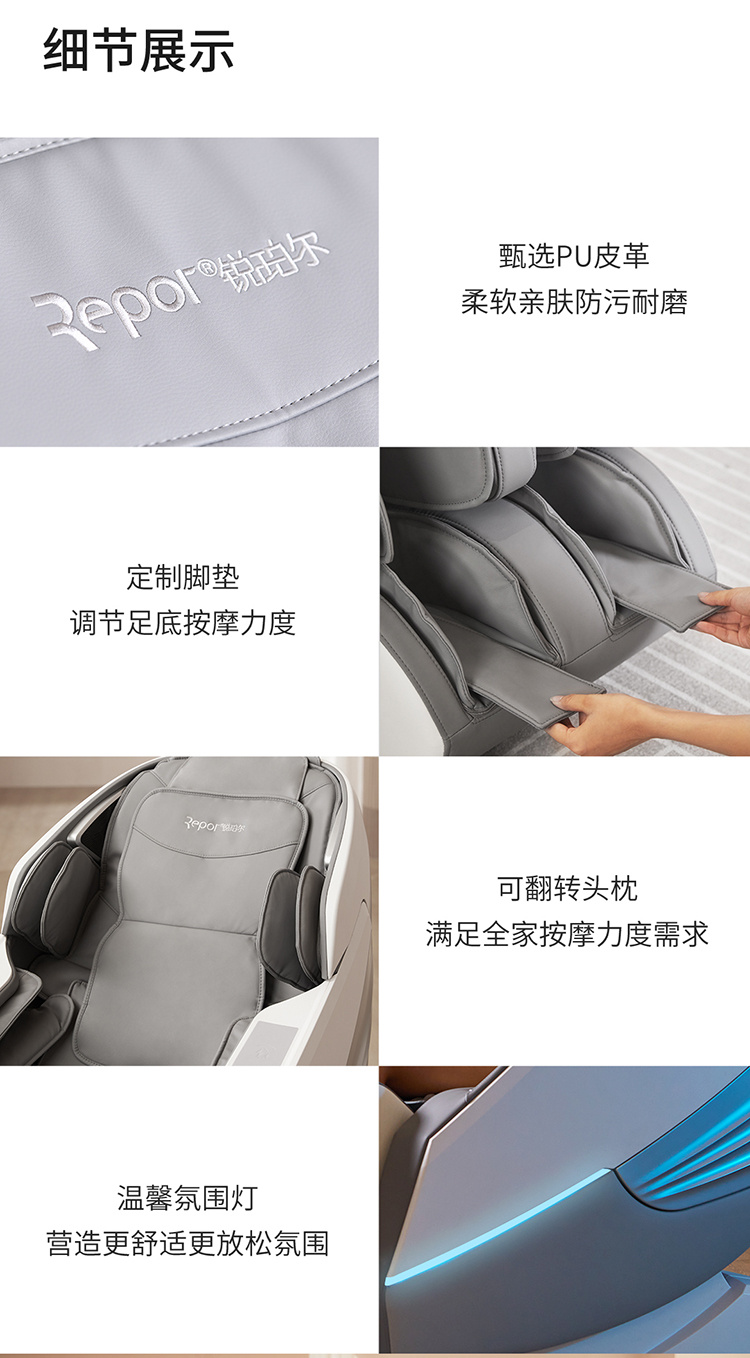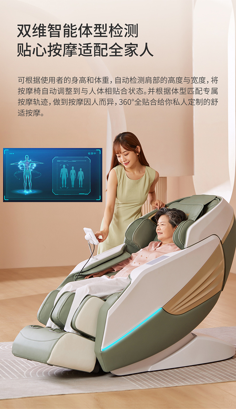 銳珀爾集十余年技術(shù)積累,傾力打造銳珀爾新款按摩椅4D穴感總裁椅,擁有全新的AI智能語音,小腿溫?zé)崛啻辍⒛_底震動、4D機(jī)械手等全新功能創(chuàng)新,智能健康體測,可以檢測血氧、心率、微循環(huán)等數(shù)值,通過大數(shù)據(jù)分析,給您提供合理的改善方法,時刻關(guān)注您的健康狀況;超大液晶智能觸控,專為總裁量身打造的特色按摩程序,20分鐘快速補(bǔ)充精力,多種按摩程序,滿足全家人的需求。