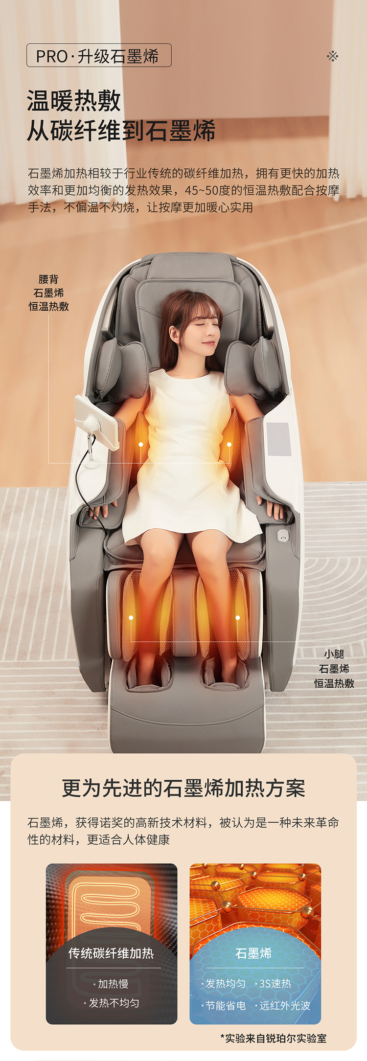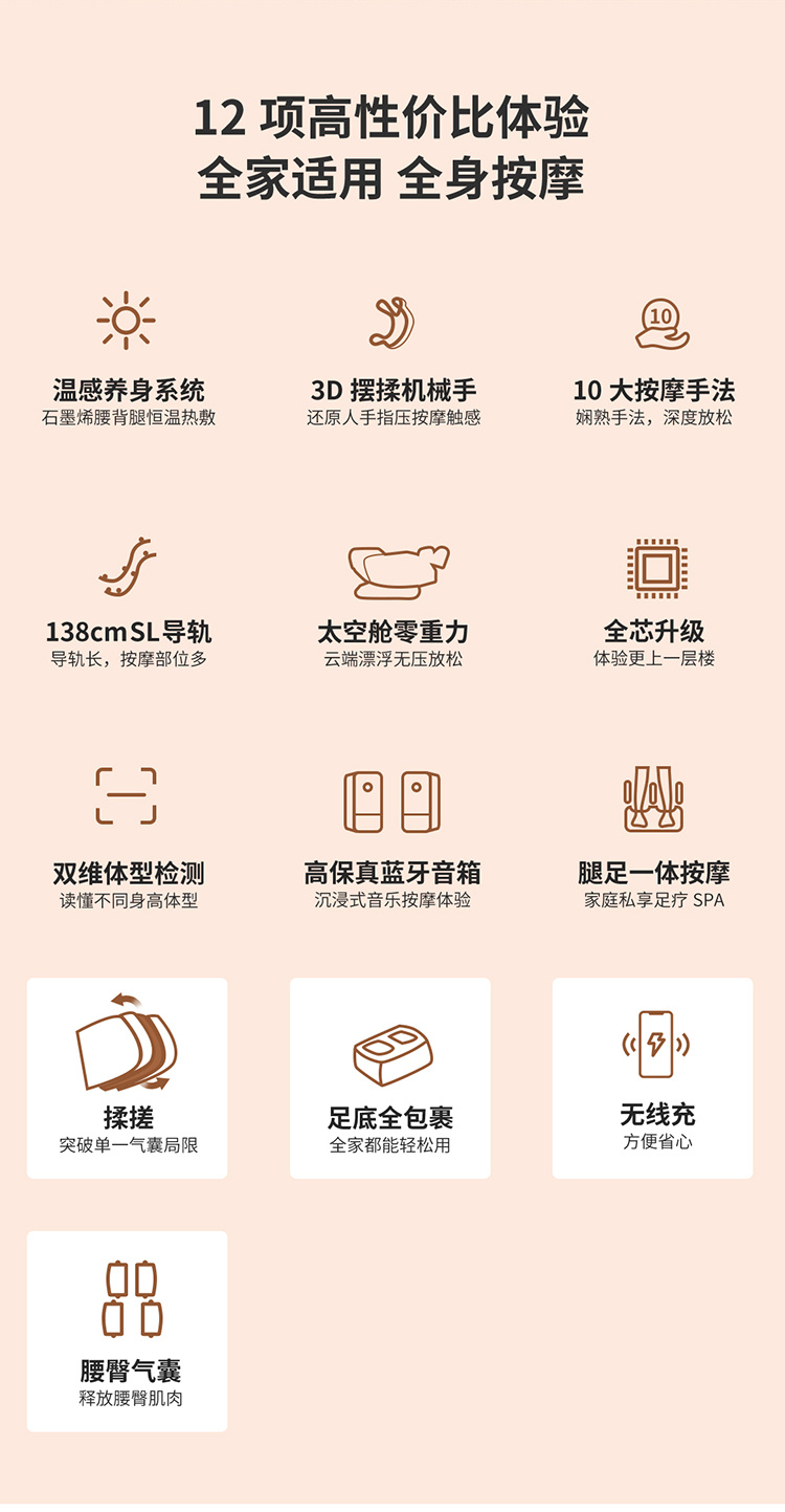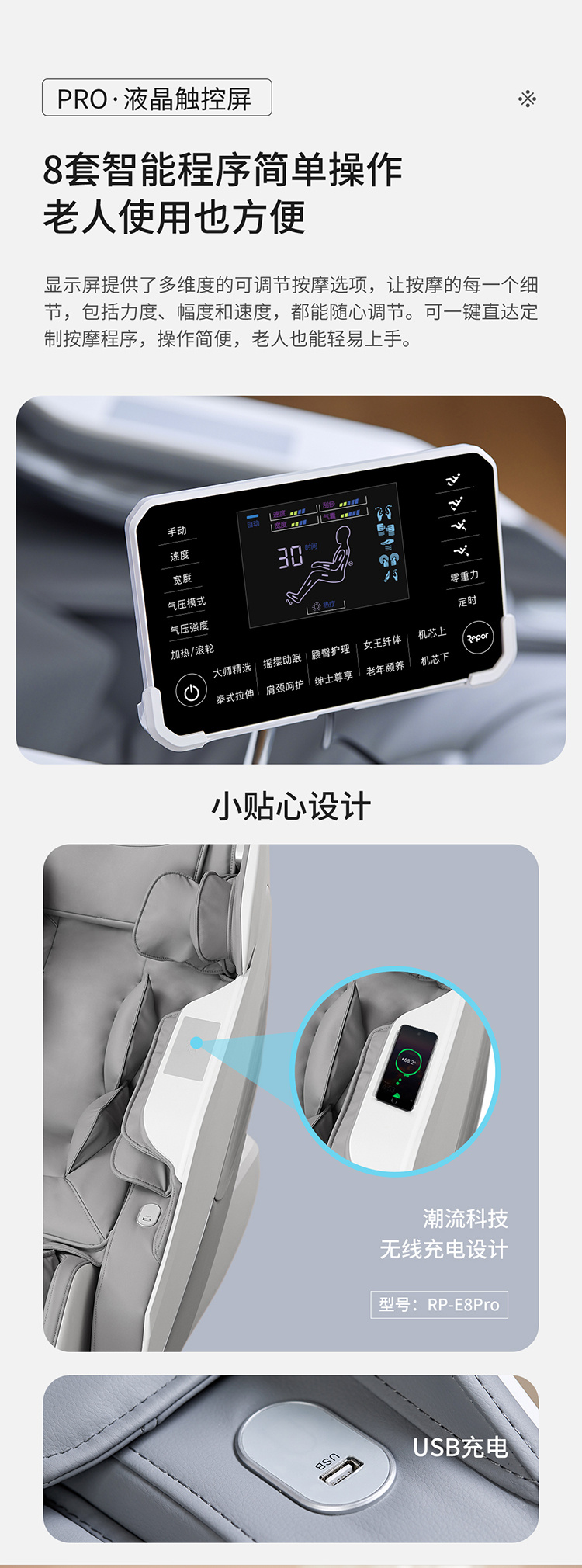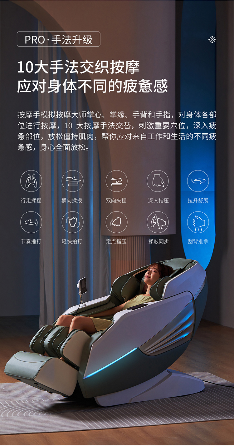 銳珀爾集十余年技術(shù)積累,傾力打造銳珀爾新款按摩椅4D穴感總裁椅,擁有全新的AI智能語音,小腿溫?zé)崛啻辍⒛_底震動、4D機(jī)械手等全新功能創(chuàng)新,智能健康體測,可以檢測血氧、心率、微循環(huán)等數(shù)值,通過大數(shù)據(jù)分析,給您提供合理的改善方法,時刻關(guān)注您的健康狀況;超大液晶智能觸控,專為總裁量身打造的特色按摩程序,20分鐘快速補(bǔ)充精力,多種按摩程序,滿足全家人的需求。