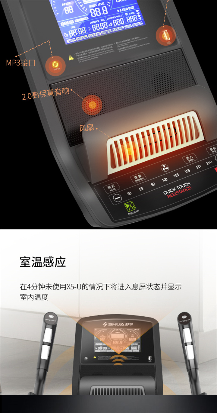 舒華商用跑步機(jī)SH-T8919采用t2.2mm黑鉆紋(可選配:t2.4免維護(hù)跑帶)的跑帶,,選用手握心率測(cè)試 自帶心率帶及增加心率控速(HRC)程序模塊、接觸式心率感應(yīng)測(cè)量心跳等數(shù)據(jù),跑步面積達(dá)580×1570mm,可承受180kg的使用者使用。
