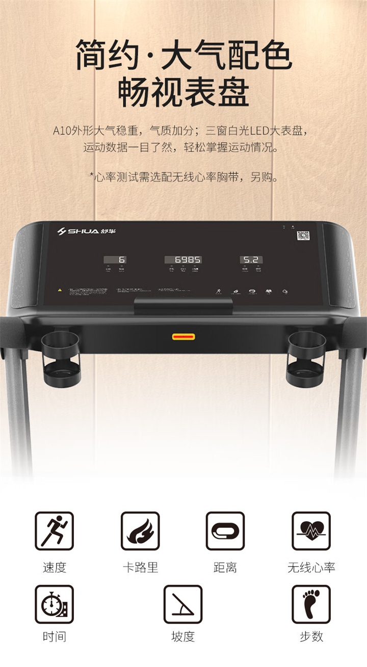 舒華家用跑步機(jī)SH-T5100持續(xù)馬力達(dá)1.25HP,具有500×1350mm的跑臺(tái),運(yùn)用無線心率接收模塊監(jiān)測心率,運(yùn)用6位硅膠減震設(shè)計(jì),最大承重是126kg,可以滿足大多數(shù)家庭的使用。